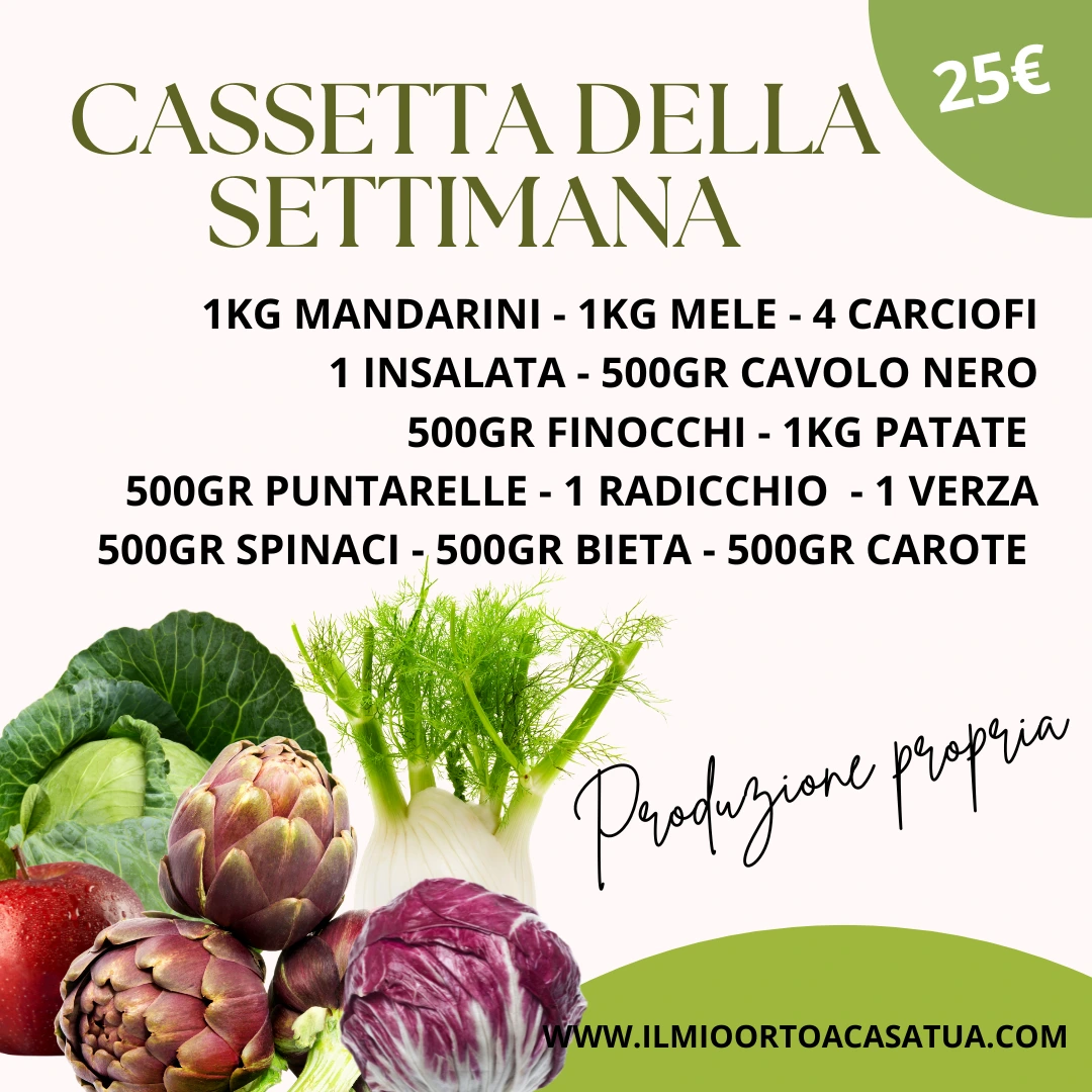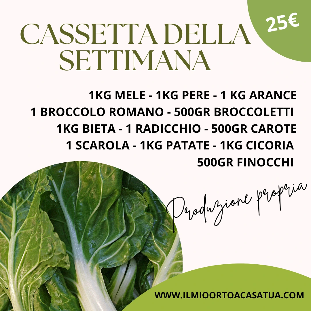Il contenuto varia di settimana in settimana in base alla maturazione e alla disponibilità dei prodotti nei nostri campi.